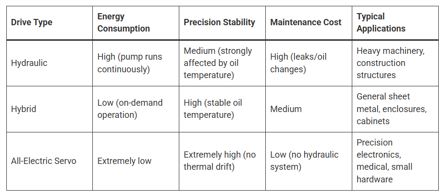 The heart of any press brake is its drive system. Over the past two decades, drive technology has undergone a revolution from brute force to intelligent control. The drive type you choose directly determines your plant’s energy consumption, maintenance intervals, and ultimate precision ceiling.
